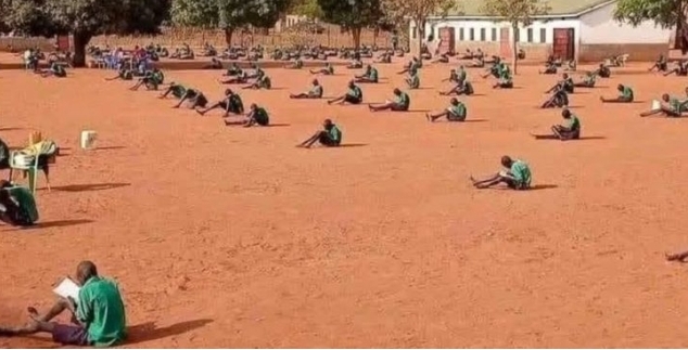 A photo showing pupils writing exams while seated on the ground in an open field has gone viral again on Ugandan social media as the 2025 Primary Leaving Examinations (PLE) take place.