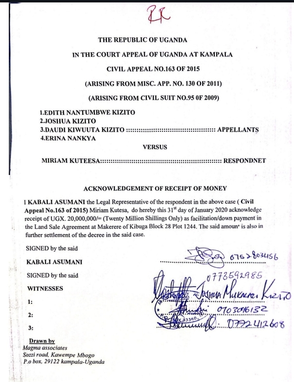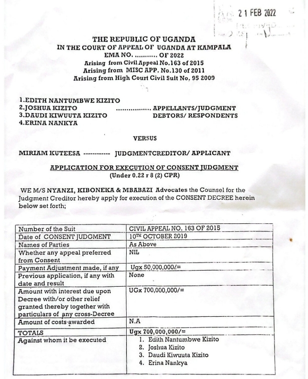 In the same ruling Justice Nassuna confirms that the consent in both the High Court and Court of Appeal are valid and has never been set aside. There is overwhelming evidence that Kuteesa received Shs50m as part payment on July 23, 2020 and acknowledges receipt with her finger print. Her lawyers also acknowledged payments in writing on January 31, 2020 and February 26, 2020 respectively. It is also on court record that on February 21, 2022, Kuteesa’s lawyers M/S Nyanzi, Kiboneka and Mbabazi advocates filed in Court of Appeal in execution of the balance of the money of the consent judgment.