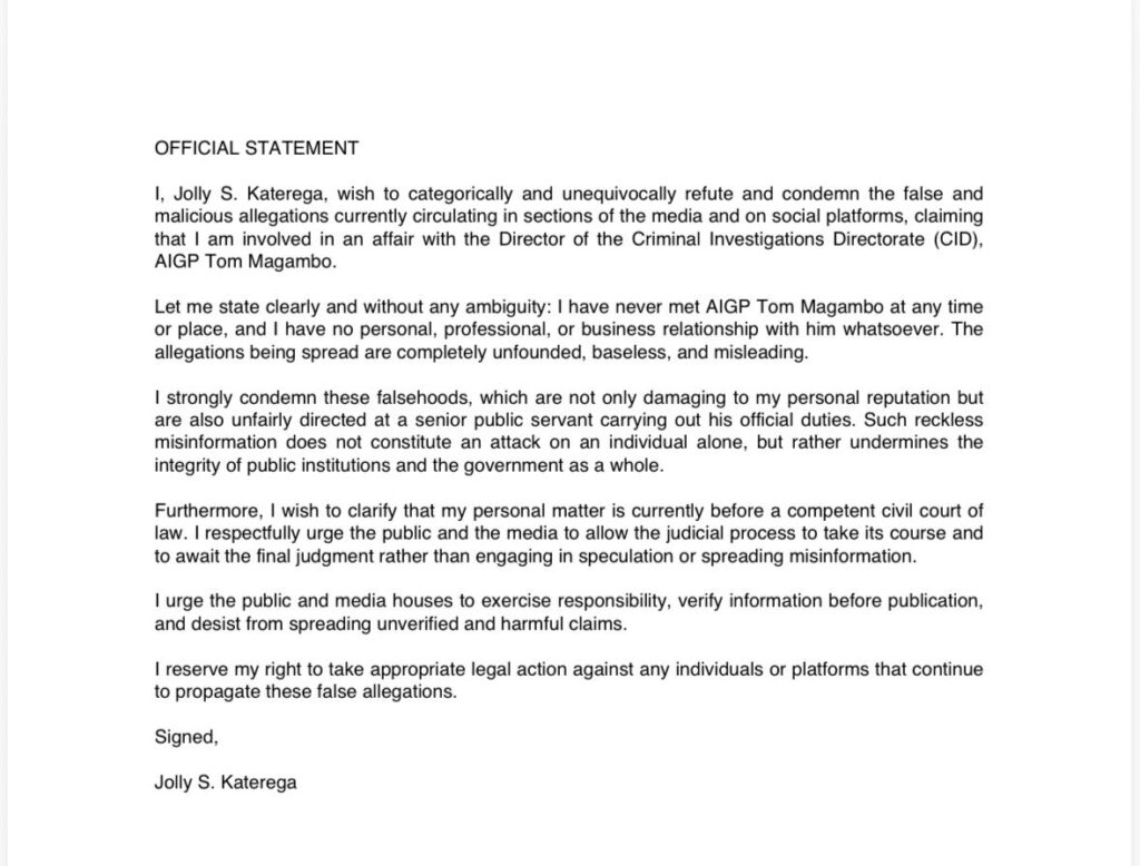“I wish to categorically and unequivocally refute and condemn the false and malicious allegations currently circulating in sections of the media and on social platforms, claiming that I am involved in an affair with the Director of the Criminal Investigations Directorate (CID), AIGP Tom Magambo,” Jolly said.