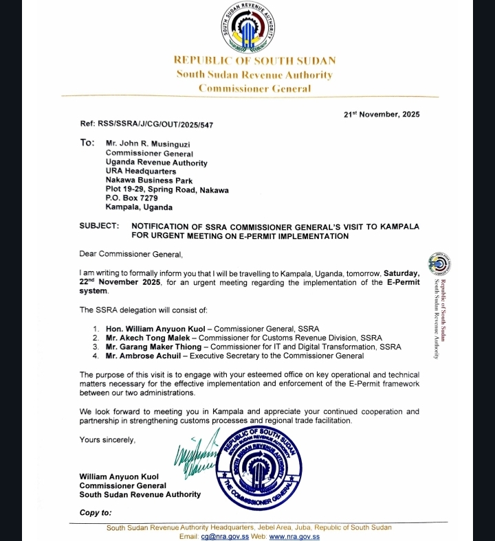 Following the letter dated November 21, 2025 and referenced RSS/SSRA/J/CG/OUT/2025/547, the SSRA CG notifies the URA Commissioner General about the unscheduled urgent meeting regarding the implementation and enforcement of the E-Permit system between the two administrations.